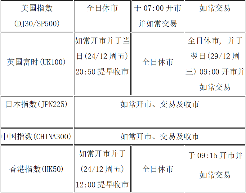 由于各地市场圣诞节假期影响,本公司以下产品的交易时间将于2021年12月24日(周五)至12月29日(周三)作出如下安排,敬请留意。