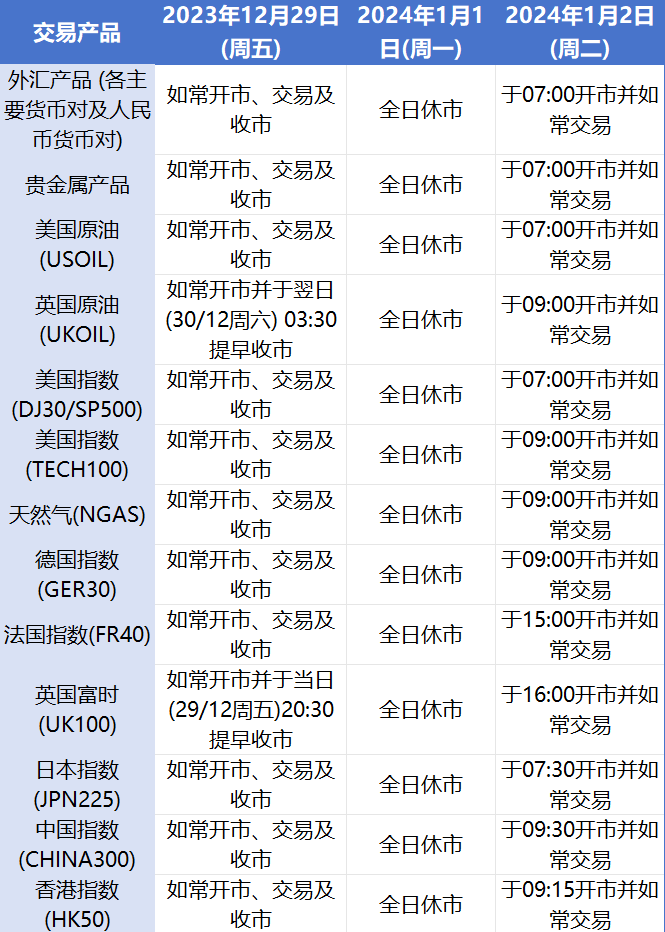 由于元旦假期影响,本公司以下产品的交易时间将于2023年12月29日(周五)至2024年1月2日(周二)作出如下安排,敬请留意。